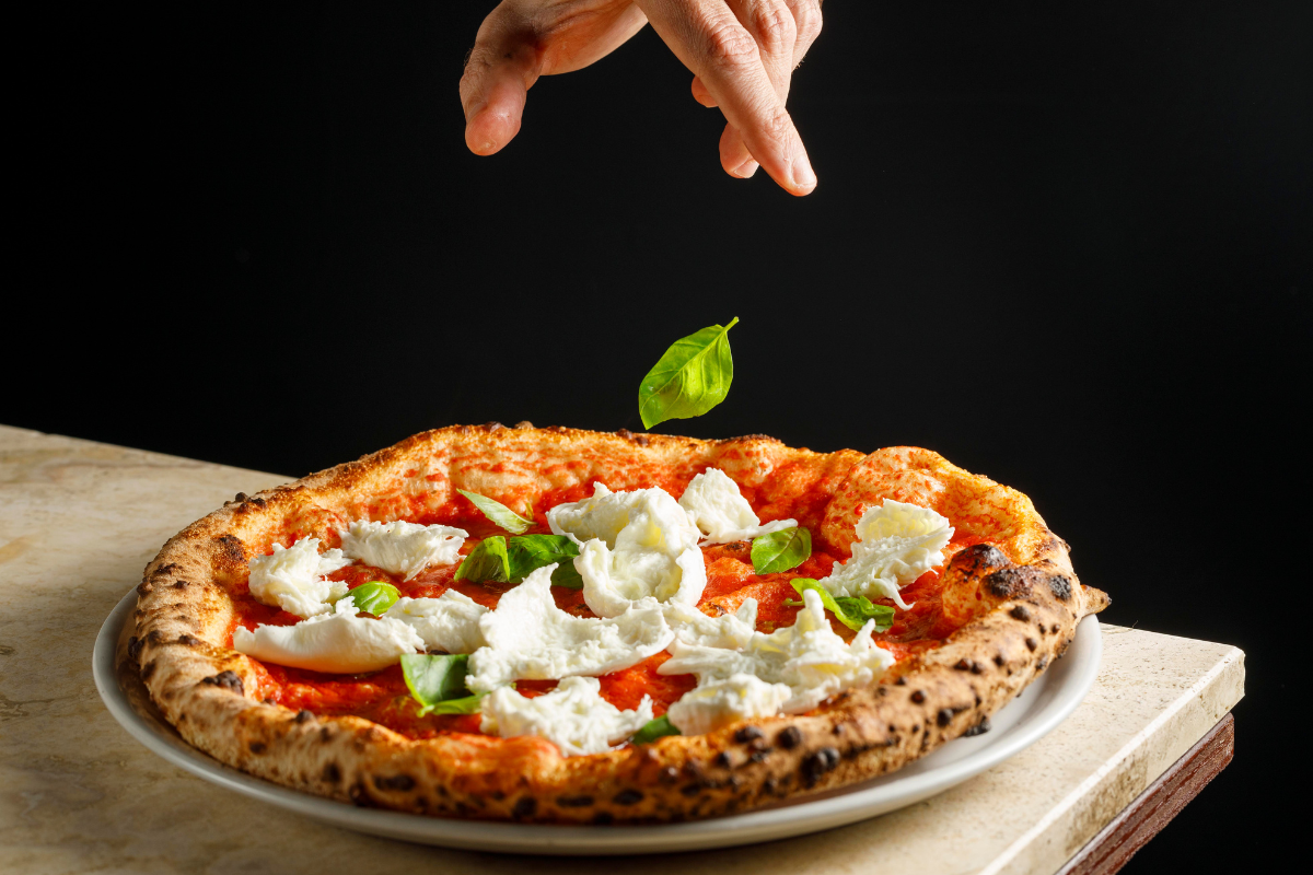- Technique to stretch the dough and to season the pizza.